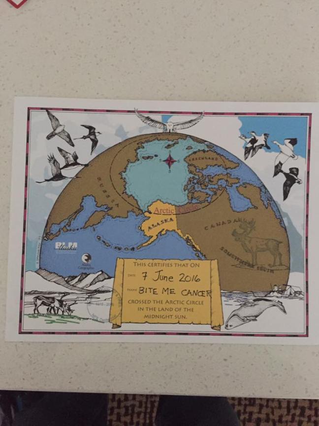 I’m thankful as well for our media coverage for our event. Our local newspaper, the Capital, and journalist Melissa Krol, a Cancer survivor herself, wrote a story featuring Madeleine, the Bite Me Cancer Organization, and my fundraising ride. Equal in thanks to our local government, for featuring our ride on weekly cable TV broadcast of “This Week in Review.” Dave Abrams and Kristin Lagana were wonderful to include our story in their programming to rally awareness and support. And finally, thankful to my adventure blog parallels my personality…i.e. random and scattered. Thankful and fortunate as well to have April, my executive assistant, handle all of the advertisements and publicity from beginning to end for my ride. The pressure was on for me since April has done publicity for bands such as Peter Frampton and Cheap Trick back in the day. I needed to feed her information to feed back to you via the blog. Yet what I did not foresee was how limited cell phone and wifi service would be as I traveled north, I was out of range for days sometimes. When I did receive service, I would shoot back some info and pictures, yet even time was limited as we would arrive late some evenings from the ride. Then the next day, get up early, eat, and ride. I remember getting a bad sinus headache the night we were in Deadhorse, and was up at 2:00am, in a bad sweat, downing mucho Tylenol, miserable and unable to sleep…yet did have limited wifi! It had been 3 days since any wifi service and since I could not sleep that night I stayed up and sent back what I could to April. She did a marvelous job with what was sent to her of figuring out the timeline of photos, days, etc. Below is the actual timeline of events, and my Day 1 is not the actual Day 1 of ride, since I was there a day earlier visiting a hospital.